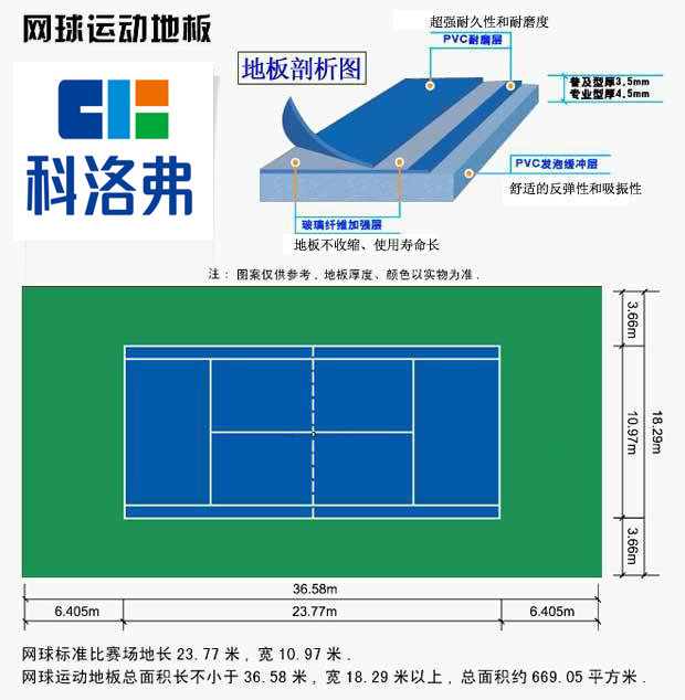 網球運動最早起源于英國。由于網球運動的激烈程度對地板的耐磨性有很高的要求,PVC塑膠運動地板具有良好的耐磨性及韌性,能夠很好的勝任運動員對地板的要求。同時PVC塑膠運動地板具有良好的防滑性,能夠是運動員的競技水平得到極大的提升,同時由于PVC塑膠運動地板的良好的減震性能夠很好的保護運動員的踝關節、膝關節等,是運動員在體驗運動樂趣的同時能夠很好的保護自己。 網球運動地板板材規格通覽: 單卷寬1.5m/1.8m 卷長20m(線內) 面層紋理:荔枝紋/寶石紋/沙地紋 總厚度:3.5mm/4.5mm/其他 顏色:天藍/草綠 場地線總長寬:23.77mX10.97m 地板總長寬:36.6mX18.3m 地板總面積:669.78㎡